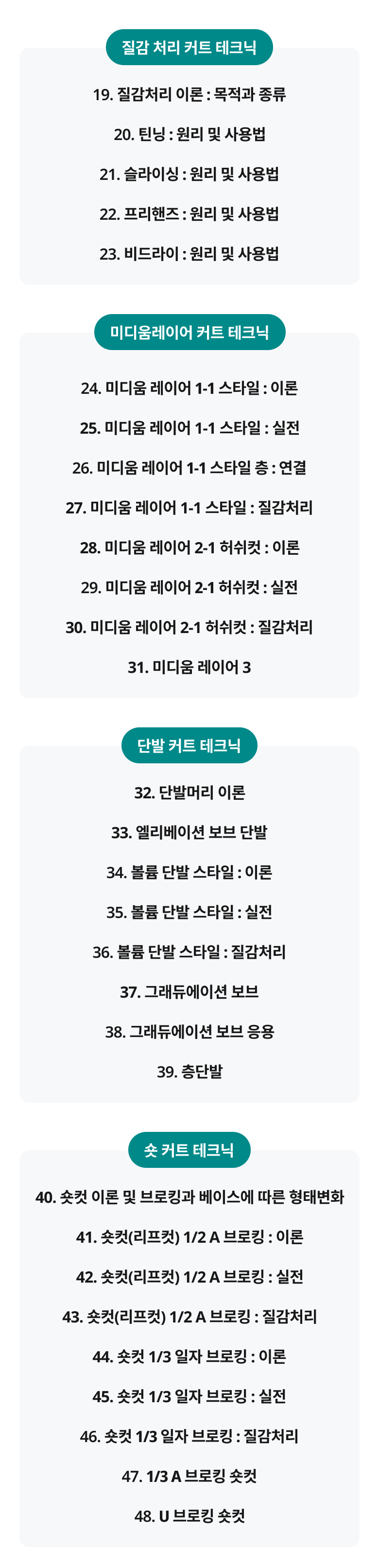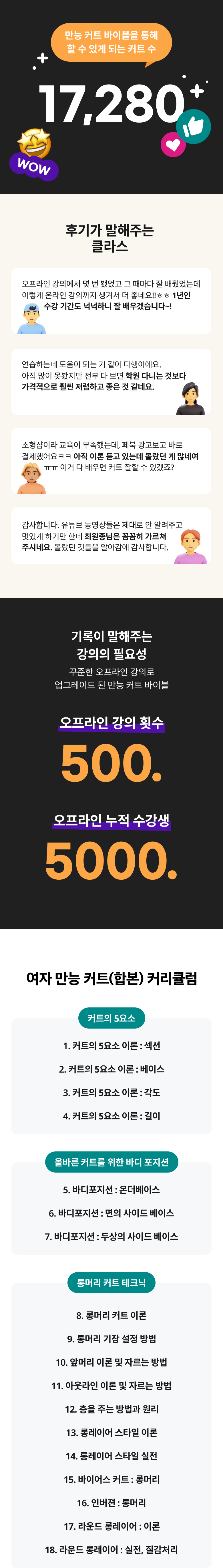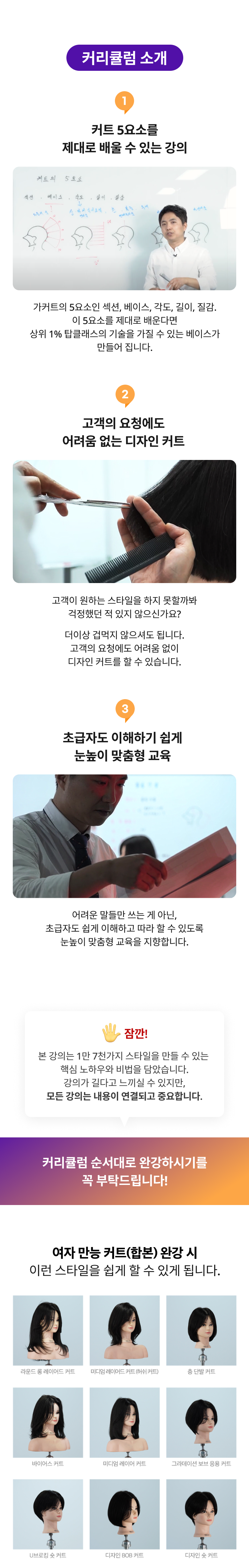 오랜 시간 미용인으로의 경험을 바탕으로 체계적이지만 쉽게 배우며 기술적 성장을 할 수 있는 커트 교육을 만들었습니다.